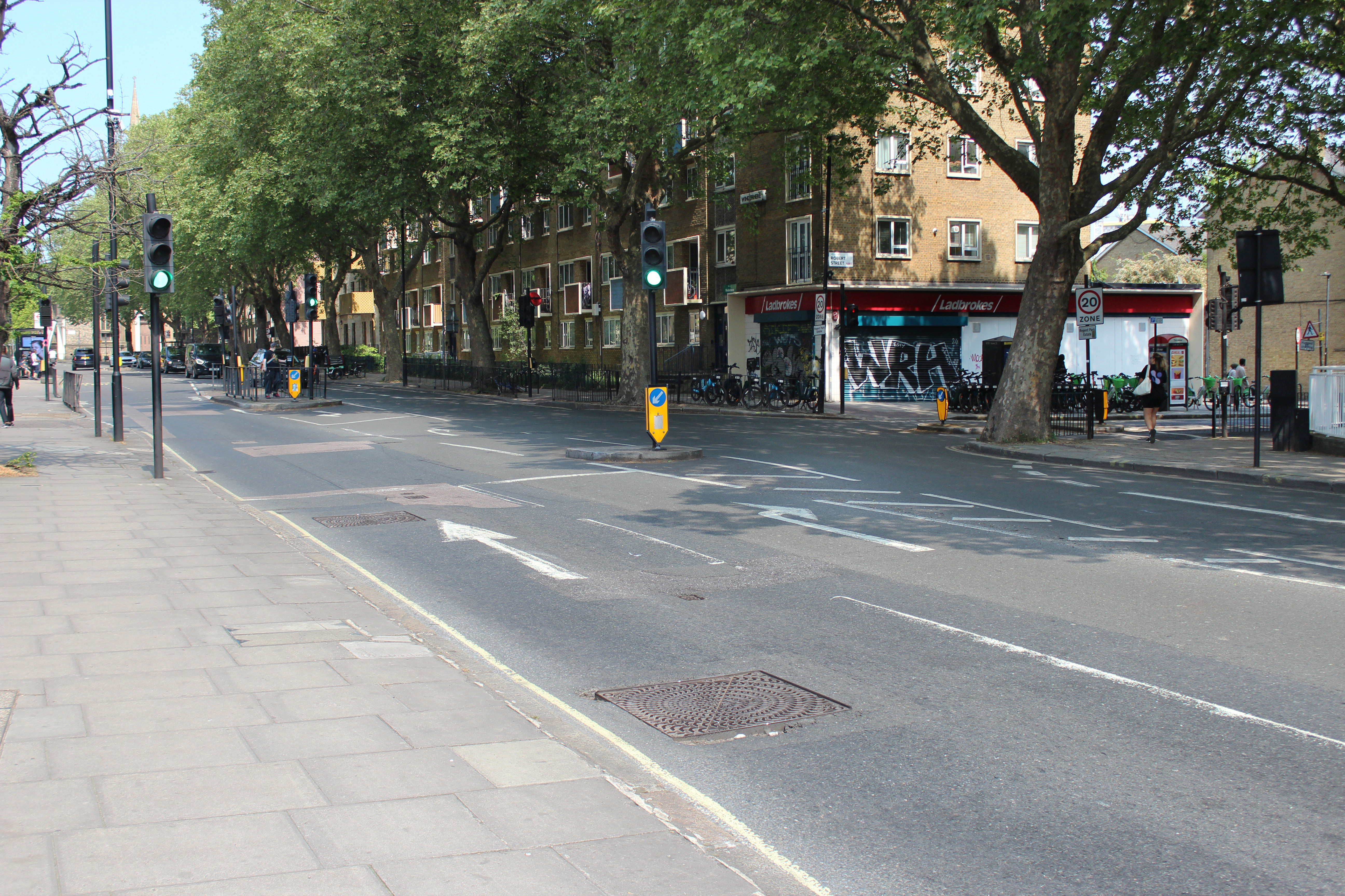 - Single lane entry for motor vehicles to and from Albany Street at all sides of the Robert Street junction, to create space for the proposed cycle safety improvements